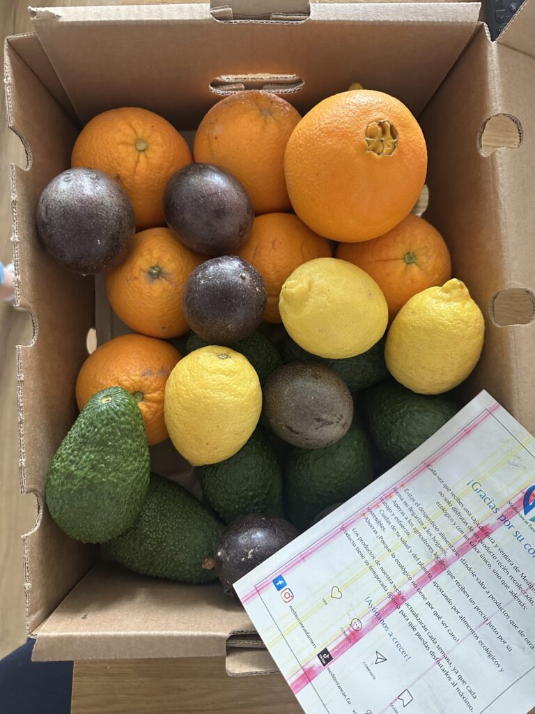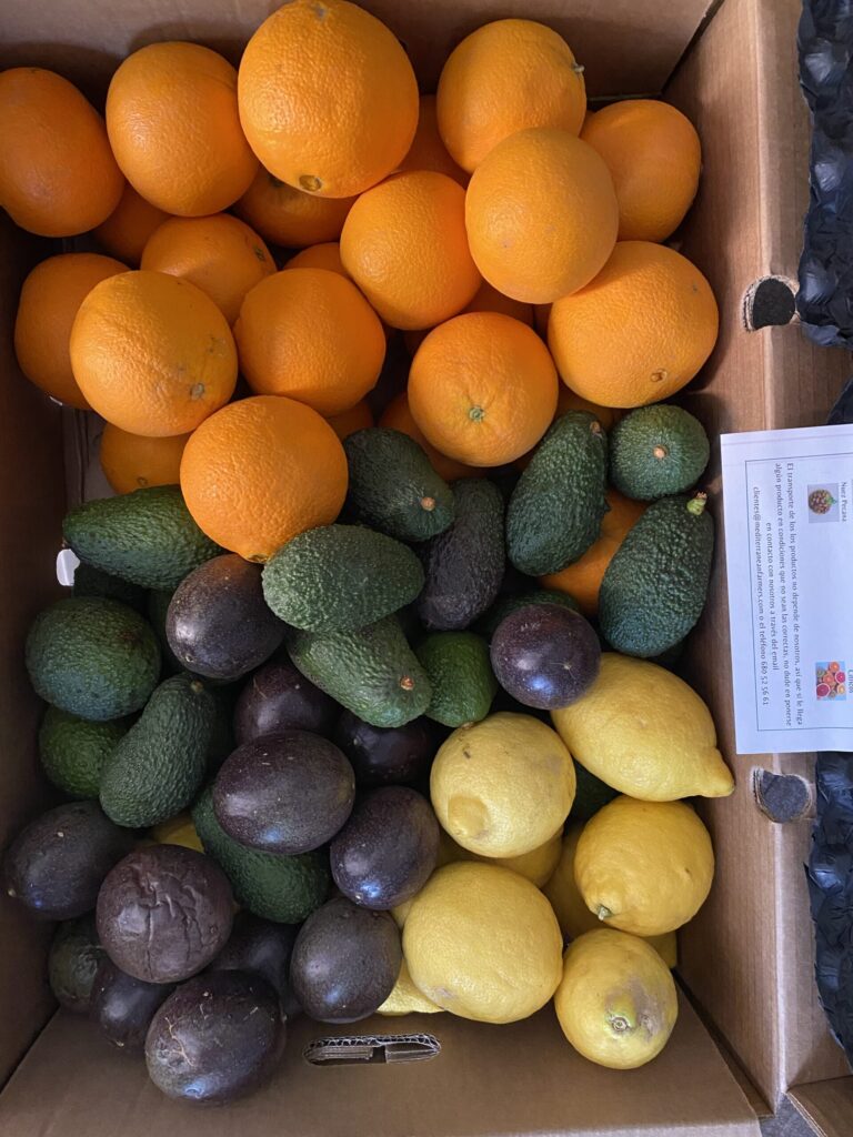 La Caja Energía Mediterránea Ecológica combina cuatro frutas ecológicas cultivadas en la Axarquía de Málaga: naranjas, limones, aguacate Hass y maracuyá.