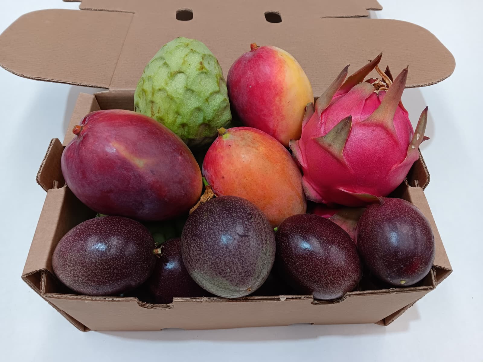 - Caja de 3,5Kg: 0,75Kg de pitaya, 0,5Kg de maracuyá, 1,5Kg de chirimoya y 0,75Kg de mango